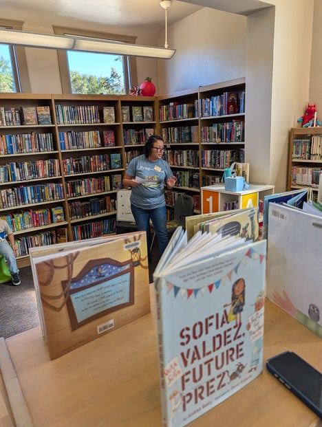 Today was divided into three parts during my shift. The first part was the Cozy Story Time, led by Ingrid, who you can see in the picture. This was a one-hour event that included a song, a story, and a pirate-themed craft. The kids were really engaged, watching closely to see how each librarian conducts story time.